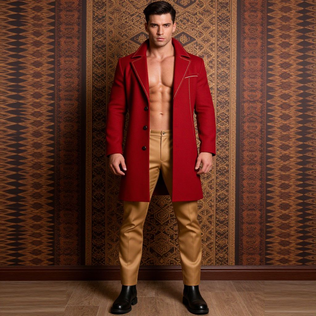 Photograph of a muscular, attractive young man with short, dark hair and light skin. He stands confidently against a patterned, brown and gold wallpaper. He wears a long, red, double-breasted coat with black buttons, left open to reveal his chiseled, bare chest. His tan pants are slim-fit and paired with black, polished dress shoes. The background features intricate, geometric patterns in gold and brown, adding a rich, luxurious texture. The overall style is modern and fashionable with a touch of vintage elegance. The man's gaze is direct and intense, adding a sense of boldness to the image.