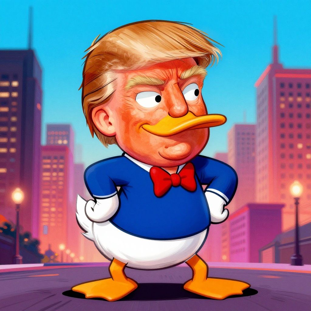 Donald trump donald duck hybrid caricature, cartoon style, vibrant colors, exaggerated features, surreal political satire, dynamic city background, bold lines