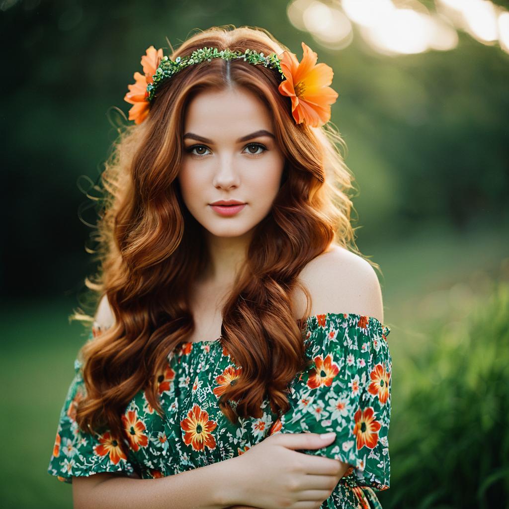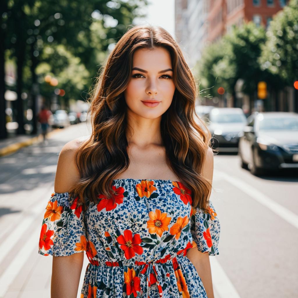 Photograph of a young woman with wavy brown hair wearing a turquoise floral dress featuring orange and pink flowers. She is standing outdoors in front of a stone wall adorned with pink and orange blooming flowers. The setting is bright and sunny, with soft natural light highlighting her relaxed and calm expression.