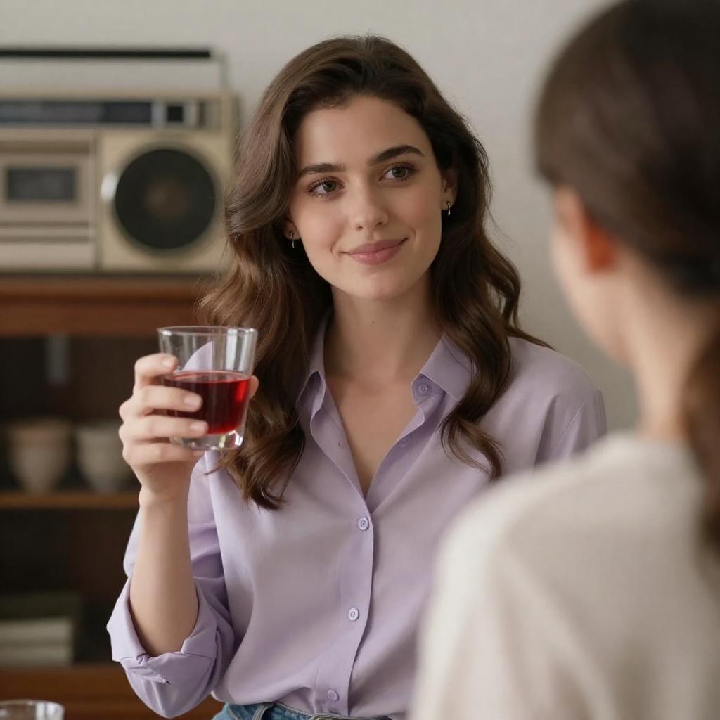Blonde woman with wavy hair, drinking from a glass, in a dimly lit living room. She wears a black jacket over a dark top. Background includes a lamp, framed photo, fireplace, green plant, and couch. Warm lighting. Cozy, domestic setting.