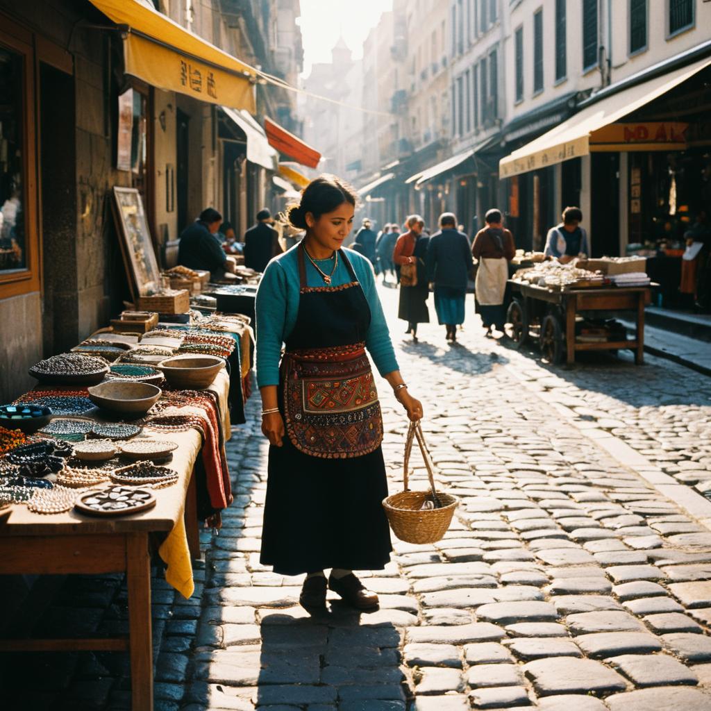 Kodak Portra cinematic film still of a street vendor selling handmade jewelry, earth-toned clothing and handmade apron, arranging colorful necklaces, on a cobblestone pedestrian street bustling with soft morning rays, nostalgic and warm vibe.