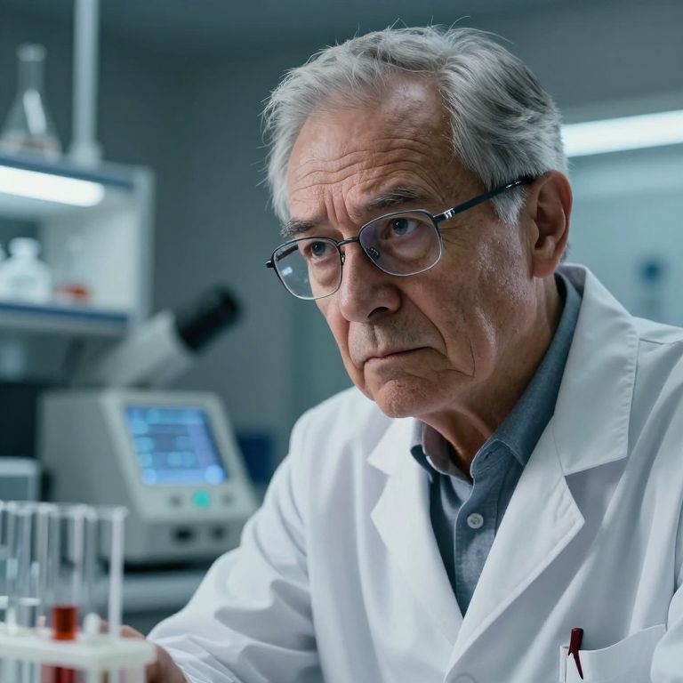 Photograph of an elderly Caucasian scientist with gray hair, glasses, and white lab coat, intensely focused in a modern laboratory.