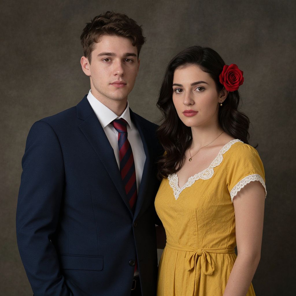 Formal portrait captures a young couple, with the man dressed in a navy suit and red-striped tie standing to the left, while the woman wears a mustard-yellow dress with lace trim and a vibrant red rose tucked into her dark hair, positioned slightly to his right against a muted, textured background.