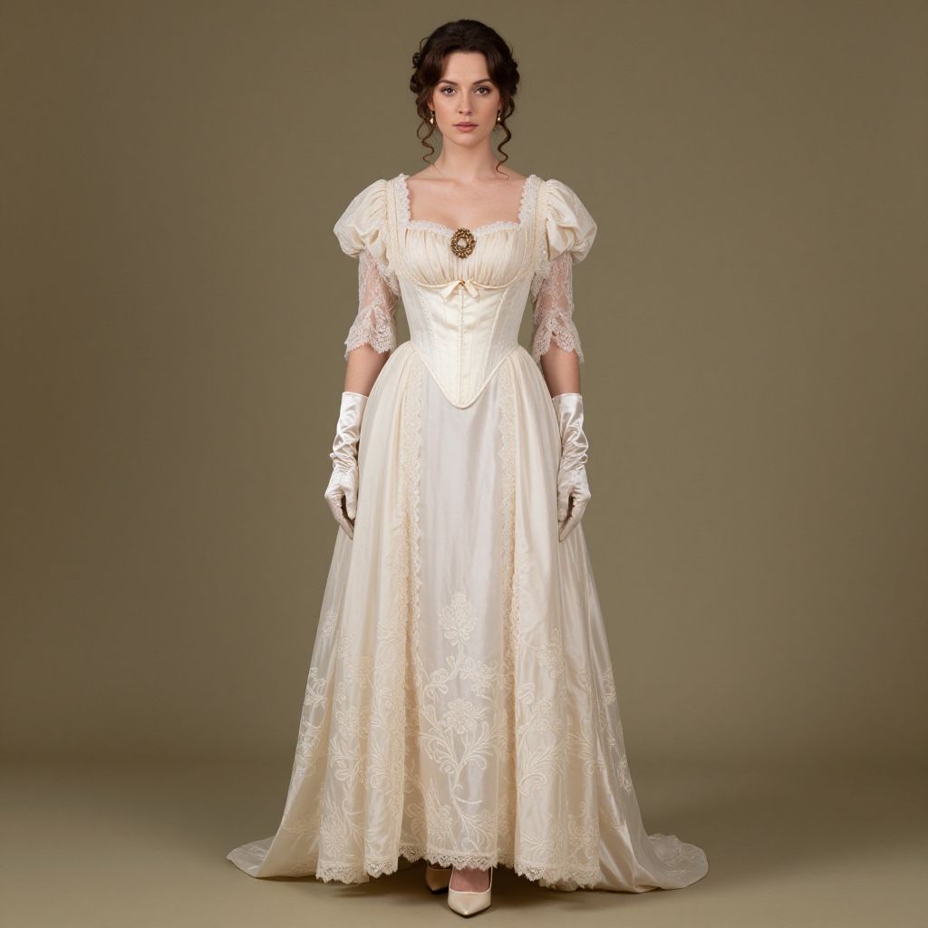 Full body shot, slim woman, elegant Regency dress, soft ivory silk fabric, high empire waist, delicate lace trim, puffed sleeves, intricate floral embroidery, flowing floor-length skirt, matching satin gloves, vintage-inspired corset, ornate brooch at neckline, soft pastel colors, layered petticoats, delicate ribbon sash, classic pointed-toe shoes, subtle vintage jewelry, romantic hairstyle with loose curls, natural makeup, soft lighting, dreamy atmosphere Sexy. Pretty face and beаutiful eyes. Big breasts