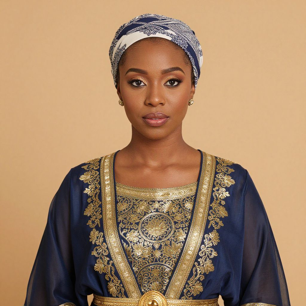 Female wearing a black and gold outfit with a white scarf around her neck and a white turban on her head. She has braided hair and earrings in her ears.