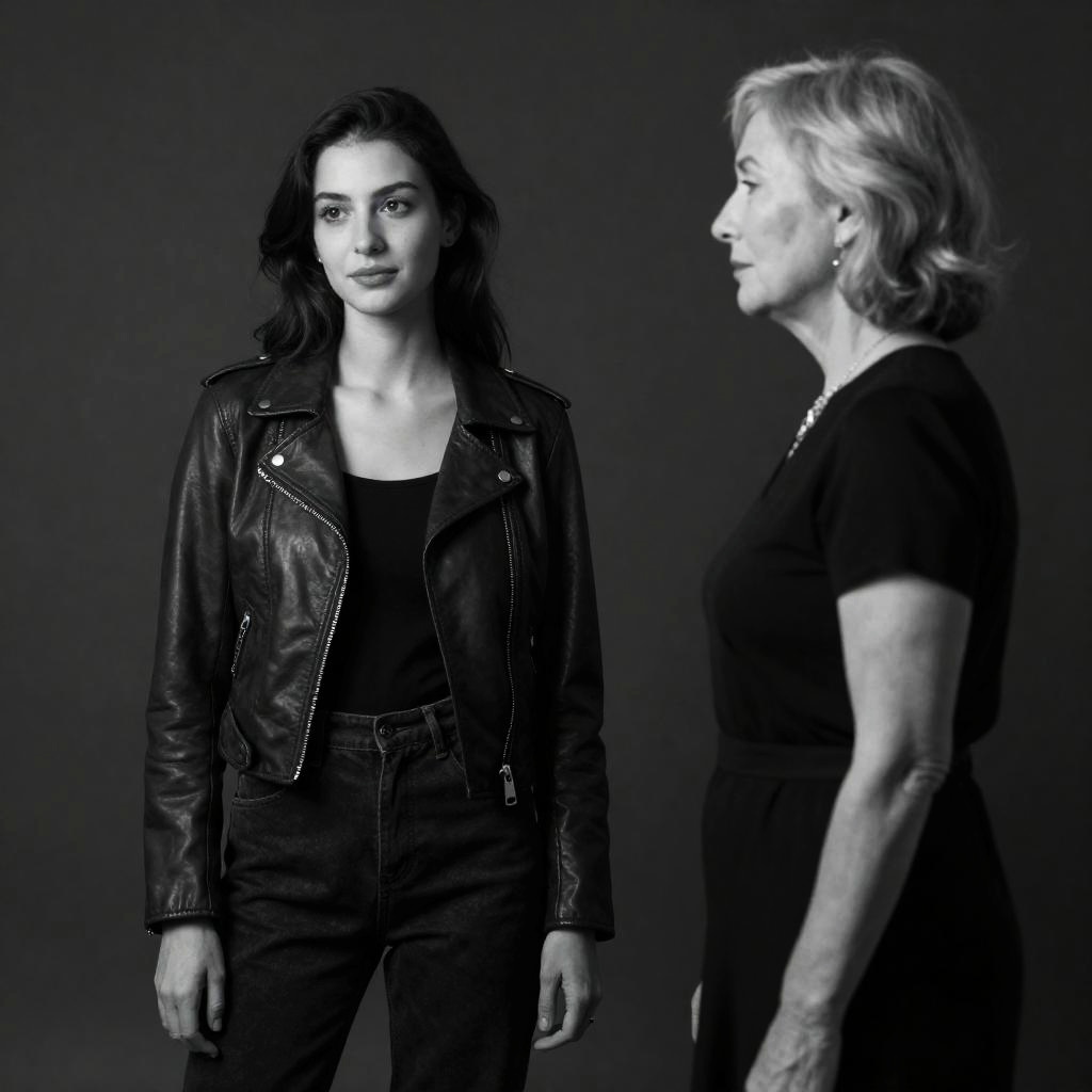 Black and white photograph of two women. Young woman with dark hair, leather jacket, high-waisted pants, hand in pocket, looking to the left. Older woman with light hair, black dress, facing right, looking at young woman. Dark ured background. Young woman's expression: slight smile. Older woman's expression: neutral. Both standing.
