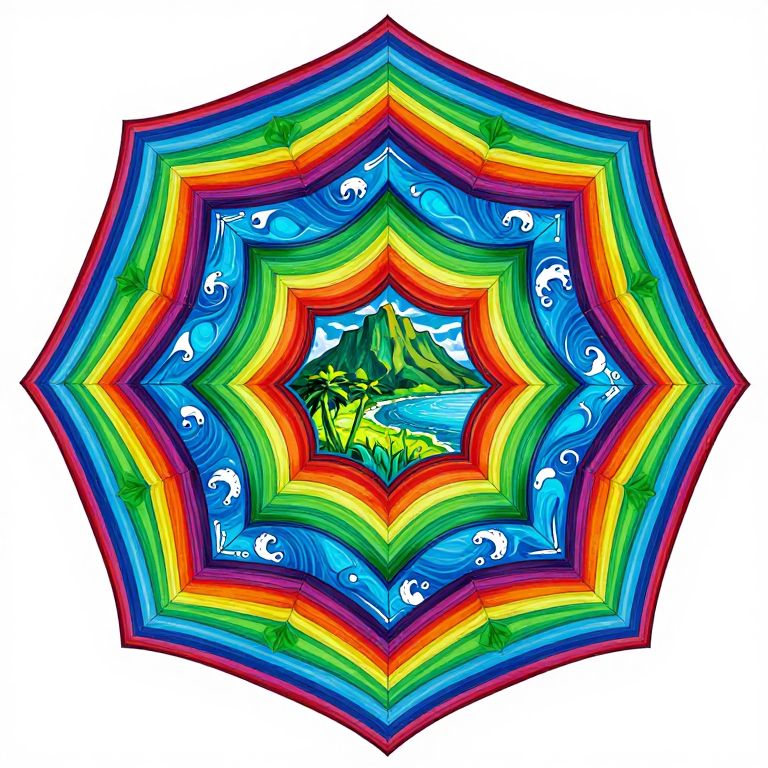 A vibrant, geometrically intricate mandala featuring a Hawaiian landscape with lush greenery, blue ocean waves, and a mountainous backdrop, all rendered in vivid, eye-catching colors.