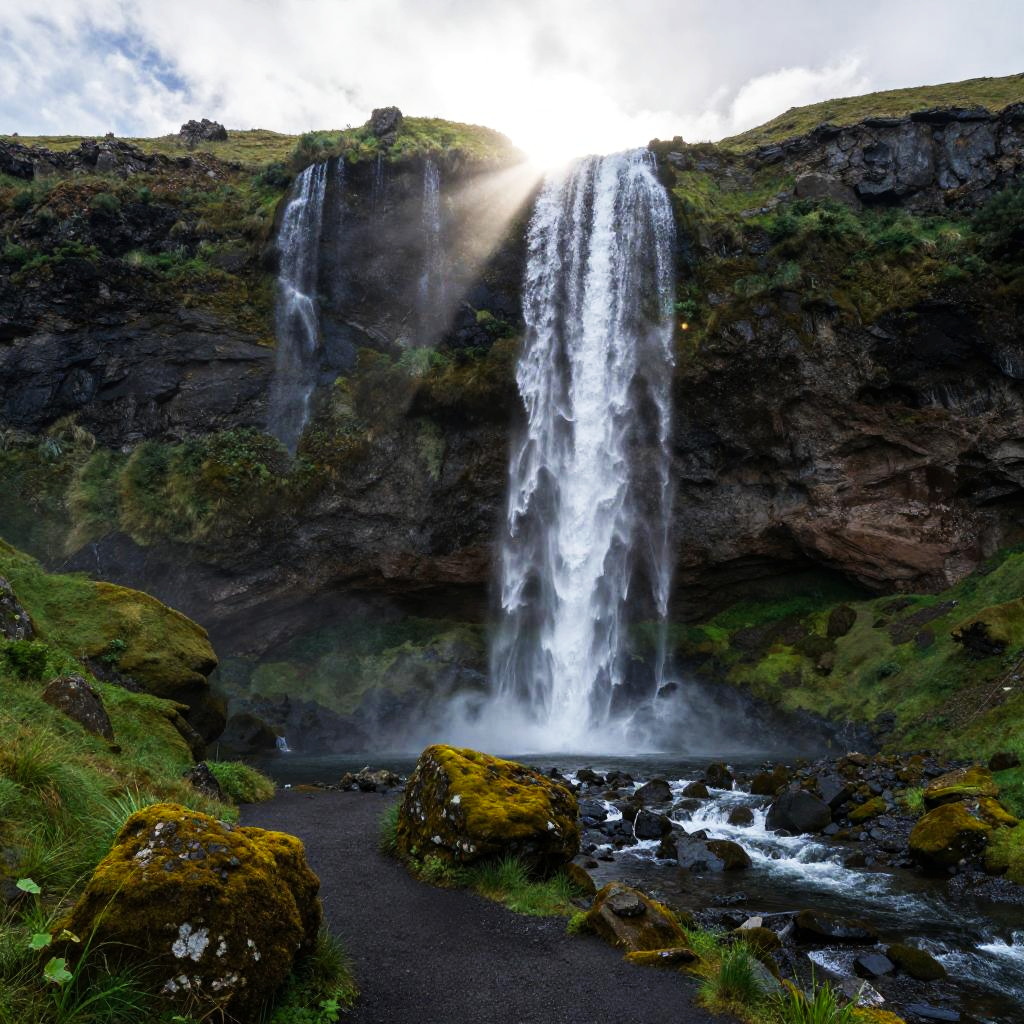 Photograph of a lush, green landscape with a towering waterfall cascading down dark, rocky cliffs. Bright sunlight shines through the mist at the top of the falls, creating a dramatic contrast. The foreground has moss-covered rocks and a winding path, while the background features more rugged, green hills. The water at the base of the waterfall is clear and fast-moving.