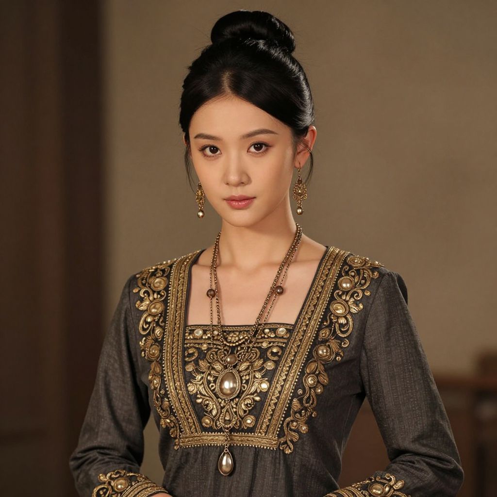 Photograph of an East Asian woman with fair skin and black hair styled in an elegant bun. She wears a dark gray, long-sleeved traditional dress adorned with intricate gold embroidery and gemstone embellishments on the chest, sleeves, and neckline. Her outfit is complemented by dangling gold earrings and a long necklace with a teardrop pendant. Her makeup is subtle, with a focus on her eyes and lips. The background is blurred, featuring warm, neutral tones and wooden elements, creating a classic, sophisticated atmosphere. The woman's expression is calm and poised.