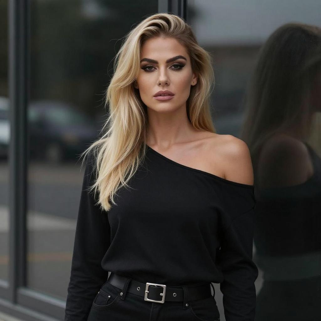 Photograph of a blonde woman with long, wavy hair in a high ponytail, sitting on a white couch. She wears a vibrant pink and black snakeskin-patterned blouse, black shorts, and black knee-high boots. Her eyes are closed, head tilted back, and she sits with her legs crossed. The background features large windows, wooden furniture, and palm trees outside.