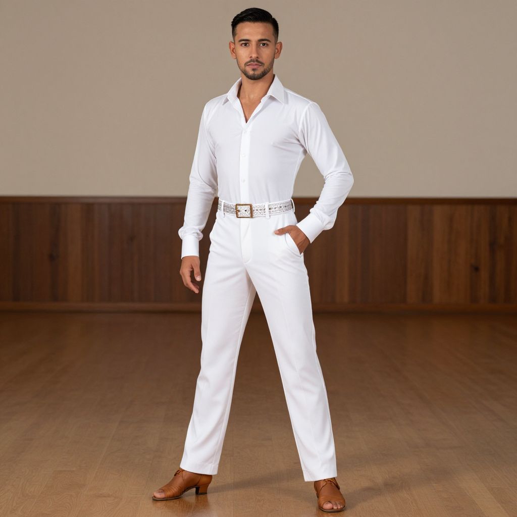 Male salsa dancer costume, 1boy, male focus, solo, belt, shirt, full body, black hair, pants, standing, facial hair, white pants, white shirt, realistic, looking at viewer, hand in pocket, indoors