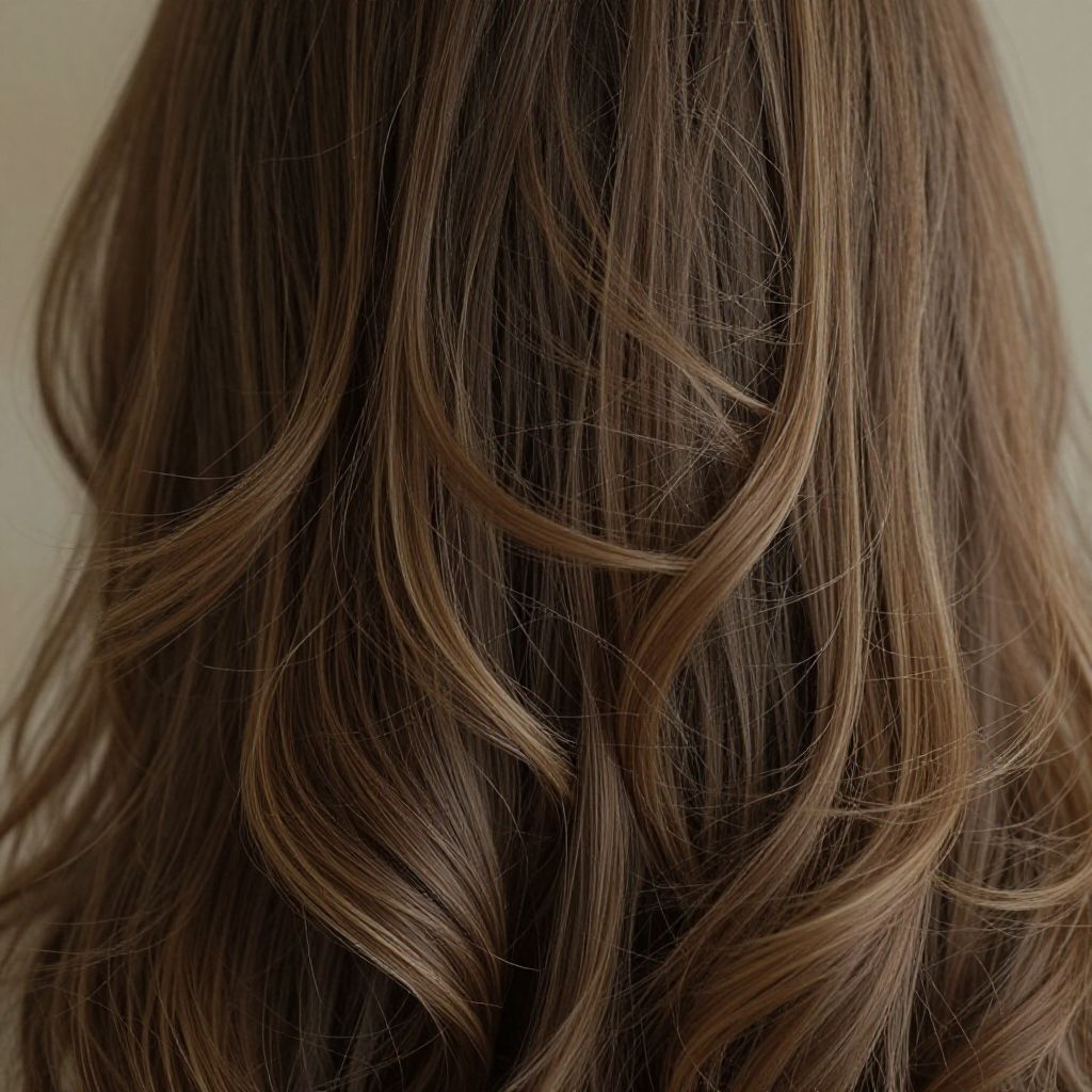 High resolution hair model, ultra-detailed strands flowing naturally, soft lighting highlighting texture and volume, realistic shades of brown and blonde, close-up view with subtle background blur, photorealistic style, cinematic depth