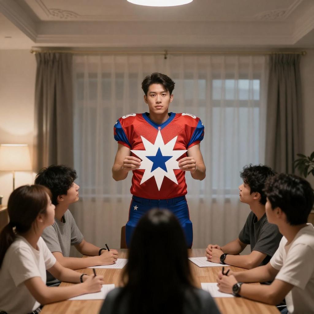 Photograph of a man in a red and blue football uniform with star patterns, standing in a room, holding a white starburst graphic in his hands. Five people seated around a table, looking up at him. Lamp on left, curtains in background, ceiling with ornate design.