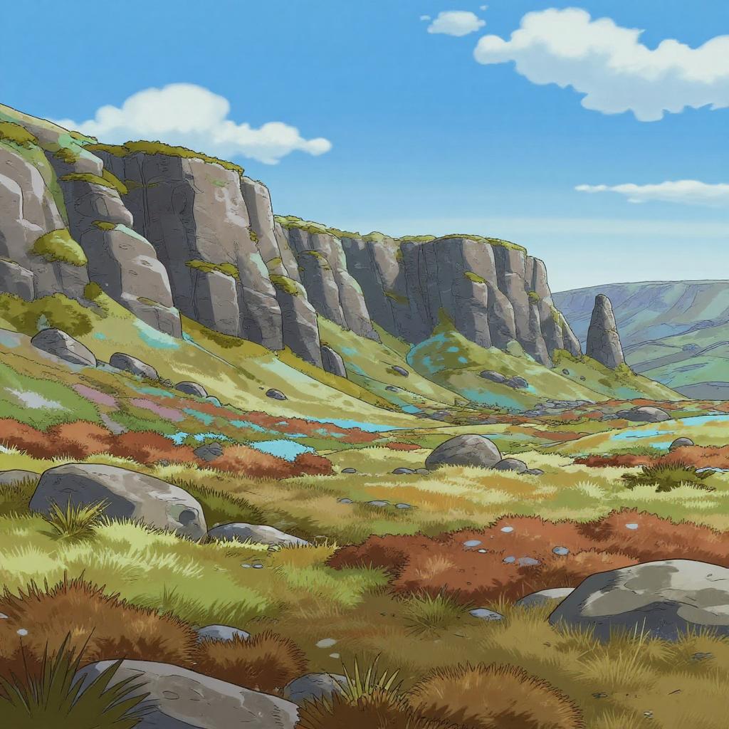 Toon-rendered landscape of frosted moorland featuring rocky cliffs under vibrant midday sunshine. Exaggerated outlines and vivid colors highlight the diverse terrain with multicolored patches of grass and stone formations scattered throughout the scene. Clear blue sky with scattered clouds above the expansive moor area.