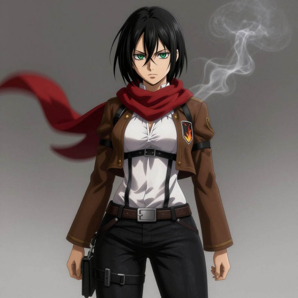 Aot style, shingeki no kyojin, mikasa ackerman, 1girl, arm strap, bangs, black hair, black pants, breasts, cowboy shot, embers, green eyes, grey background, hair between eyes, harness, long sleeves, looking at viewer, medium breasts, pants, red scarf, scarf, shirt, short hair, smoke, solo, thigh strap, brown jacket, white shirt, survey corps \(emblem\), ((masterpiece)), best quality