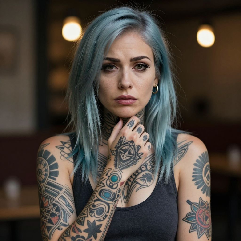 Photograph of a tattooed woman with light blue hair, looking serious and slightly sad. She's wearing a dark, sleeveless top and has intricate black and colorful tattoos covering her arms and neck. Her right hand is touching her chin, with visible tattoos on her fingers. The background is blurred with warm, glowing lights, giving a moody, urban vibe. The lighting emphasizes her tattoos and facial expression.