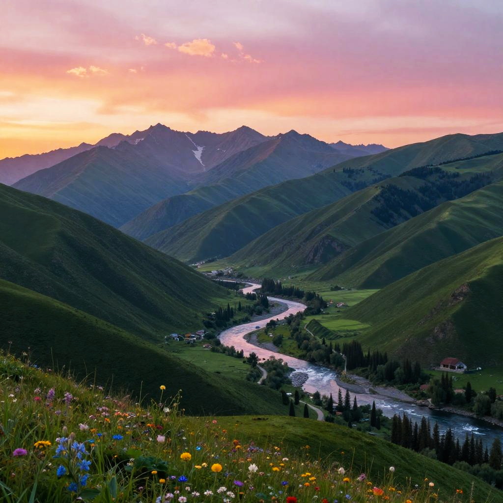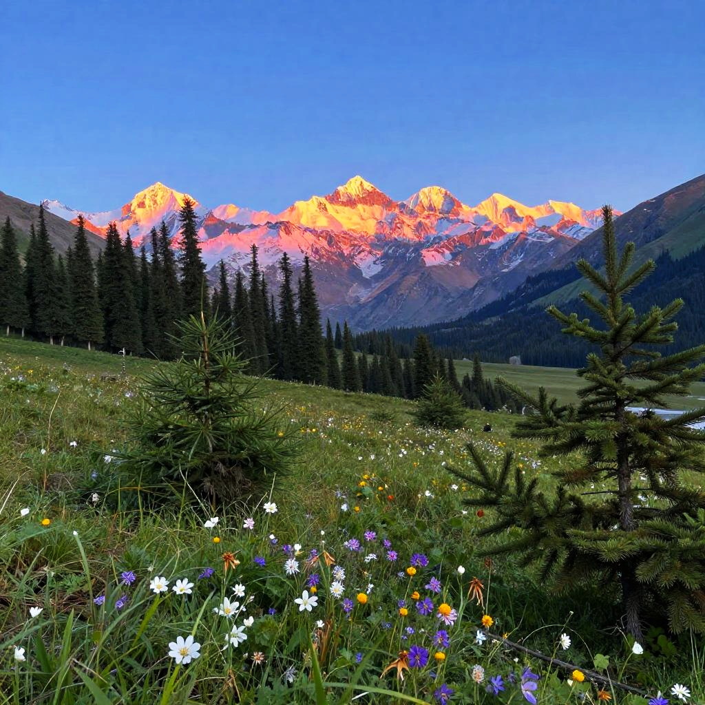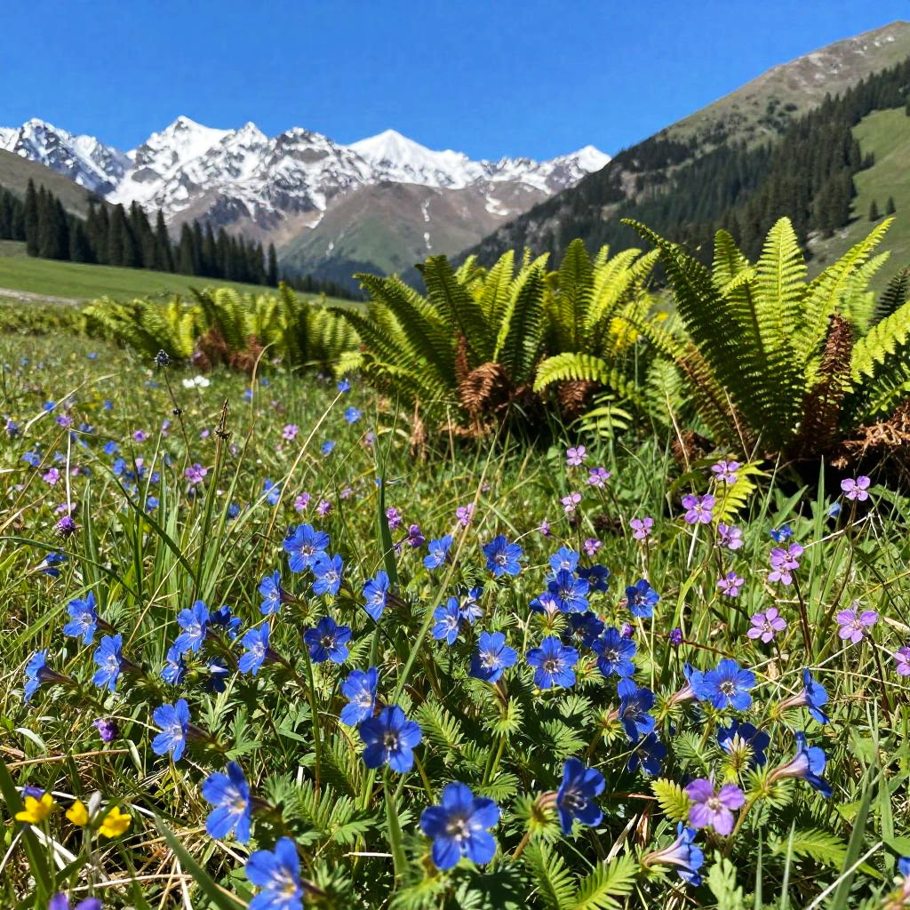 This vivid photograph showcases a lush meadow filled with vibrant blue and purple wildflowers in the foreground. Green ferns and tall grasses add texture. In the background, a snow-capped mountain peaks under a bright blue sky, with rolling hills and dense pine forests. The sunlight casts a warm glow over the scene, highlighting the rich colors and natural beauty.