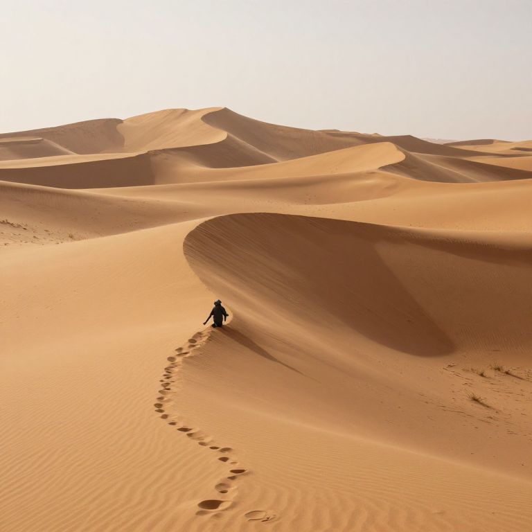 Photograph of a vast desert landscape featuring rolling sand dunes under a bright, almost white sky. The foreground shows a single person, silhouetted and walking away from the camera, leaving a trail of footprints in the fine, rippled sand. The dunes are a warm, golden brown, with sunlight casting soft shadows, creating a serene and expansive feel. The person appears to be wearing a dark-colored outfit, contrasting against the sandy terrain. The overall composition emphasizes the vastness and solitude of the desert, with the winding path adding a sense of journey and exploration.