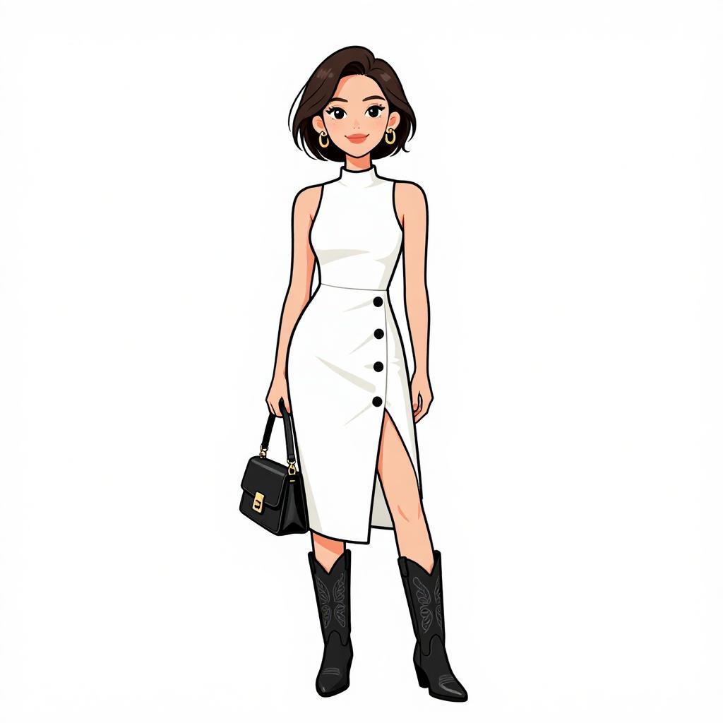 Digital drawing of a stylish woman with short, dark brown hair and fair skin. She wears a sleeveless, high-neck, white dress with black buttons and a thigh-high slit on the left side. She accessorizes with black ankle boots and a small black handbag in her right hand. Her large, dark eyes are accentuated with eyeliner, and she has a subtle red lipstick. The background is plain white, emphasizing her chic, modern outfit. The art style is minimalistic with bold outlines and flat colors, reminiscent of contemporary fashion illustrations.