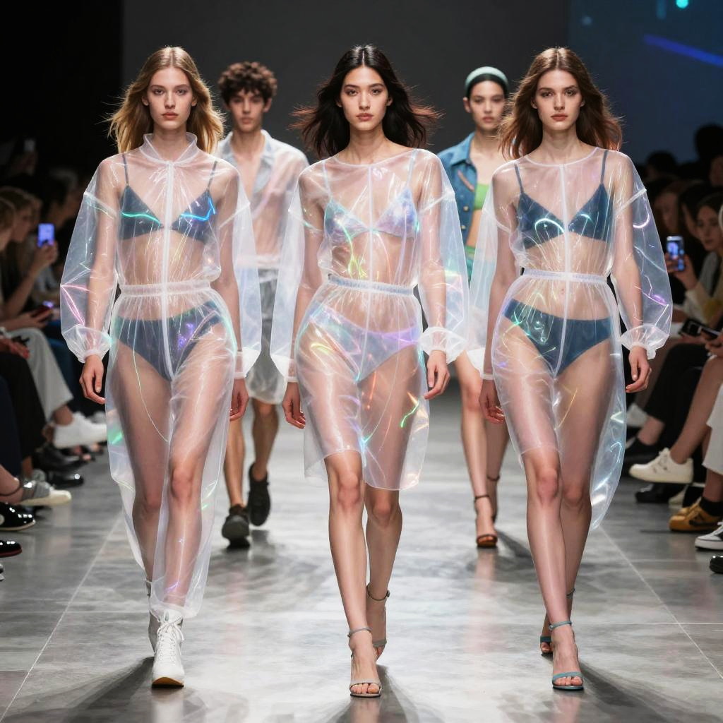 See through clothes filter online, a creative depiction of virtual fashion filters blending with reality, models walking on a digital runway with translucent outfits rendered via augmented reality, dynamic light patterns, vibrant colors, futuristic and stylish atmosphere