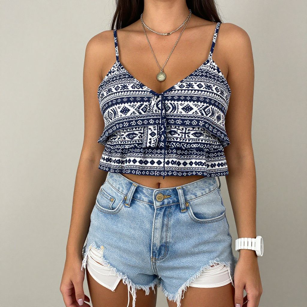"Woman, summer clothing, layered ruffle tank top in navy and white with tribal-inspired patterns, cropped above waist, frayed denim shorts, high-waisted, light wash, chunky white wristwatch, layered necklaces, pendant, casual.. Sexy. Pretty face and beаutiful eyes. Big breasts."