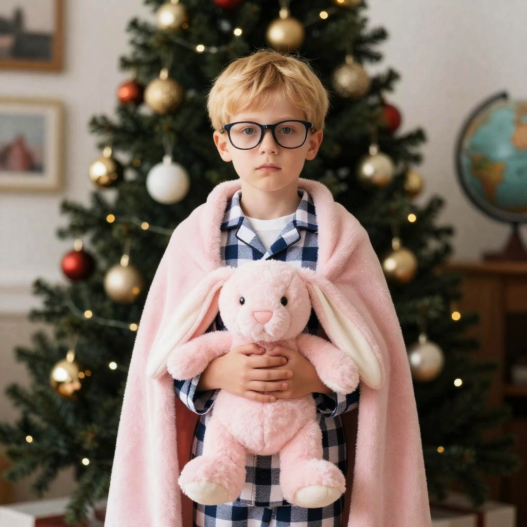 Photograph of a young boy with light brown hair, wearing a plaid shirt over a green t-shirt, holding a brown teddy bear with white facial markings. The boy has a neutral expression. Background is softly lit, with blurred indoor elements. Boy's hands rest on a dark table. Teddy bear is on the right, slightly in front of the boy.