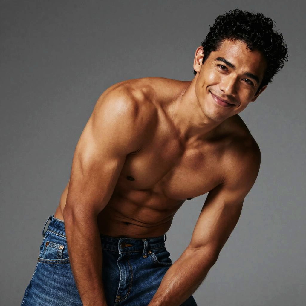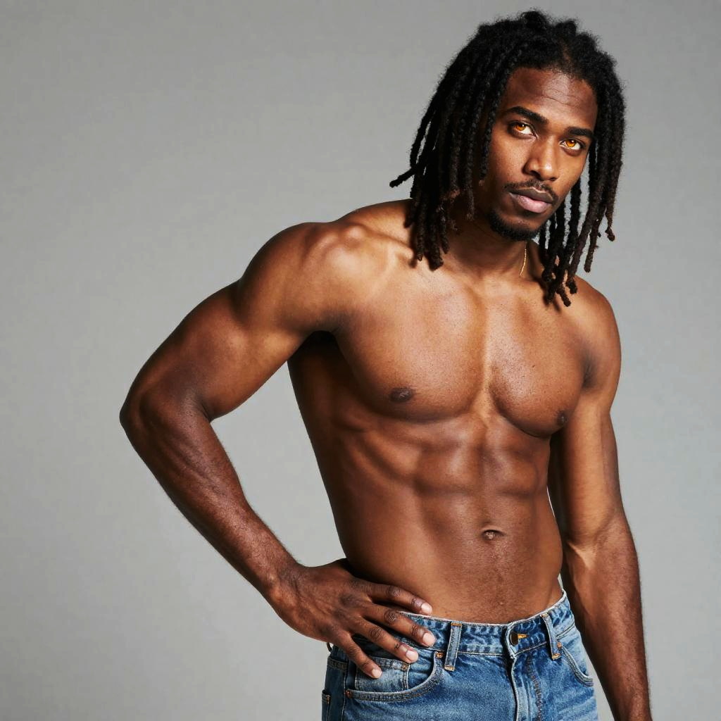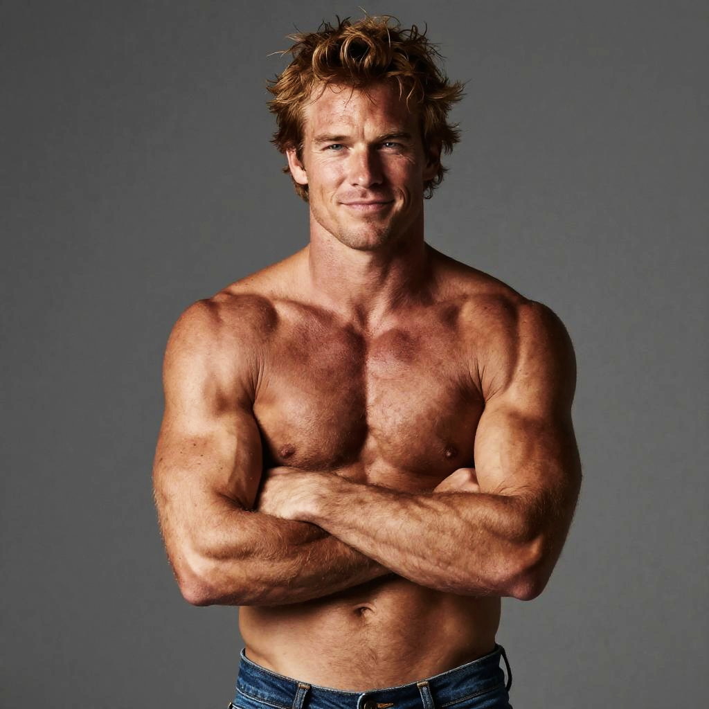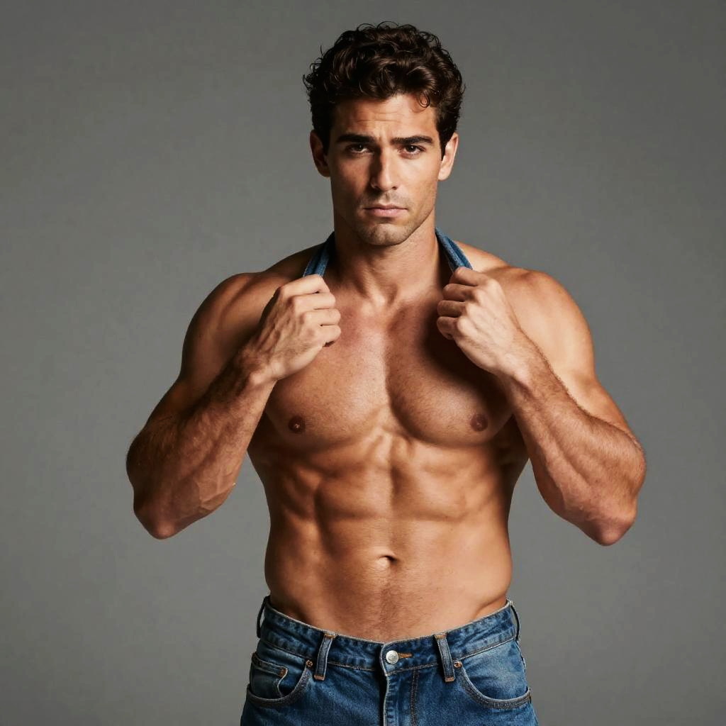 Cowboy shot, solo, muscular tall man with pale complexion and short ash blonde hair, topless male, large pectorals, abs, veiny arms, ash blonde, crystal blue, gentle smirk, leaning fingertips-hooking pockets, jeans, denim texture, grey background
