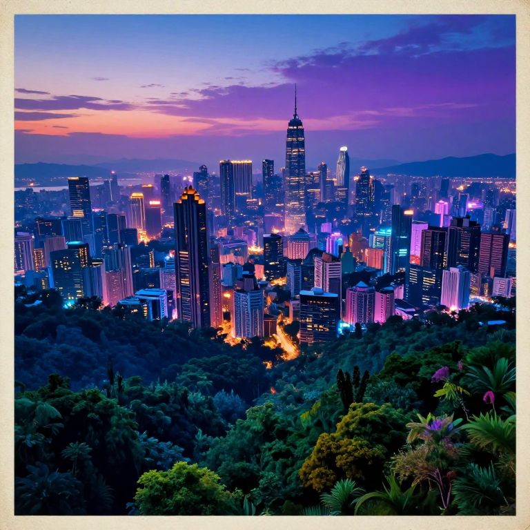 Photograph of a vibrant city skyline at dusk, featuring illuminated skyscrapers amidst lush greenery, with a colorful sunset sky in the background.