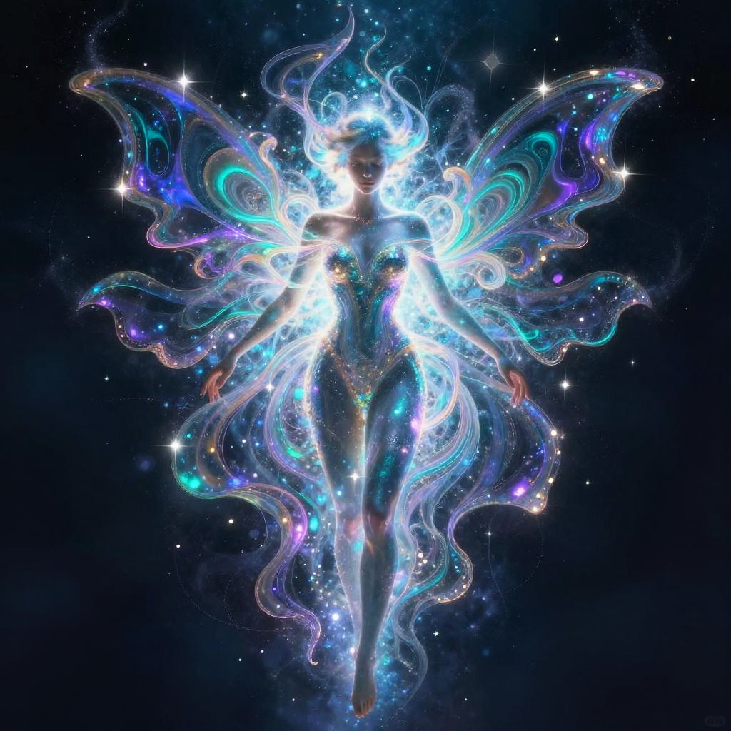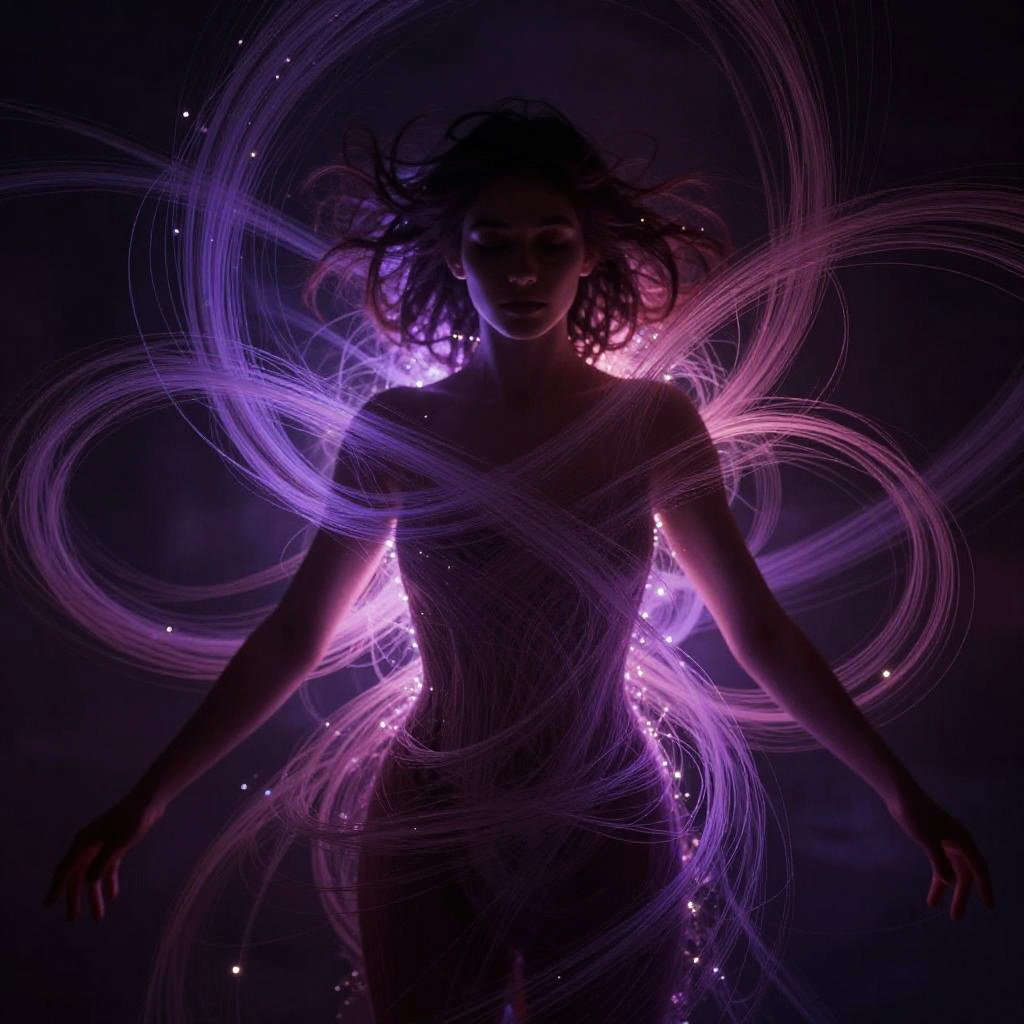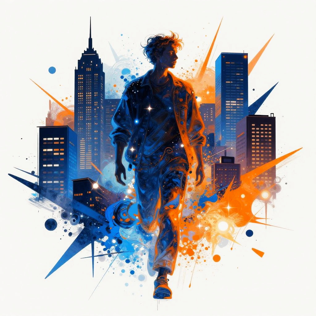 A radiant figure symbolizing the vibrancy of urban life, bursting with electric blues and bright oranges. The artwork emphasizes dynamic angles and sparkling city lights, blending abstraction and emotion in a dazzling and captivating design.