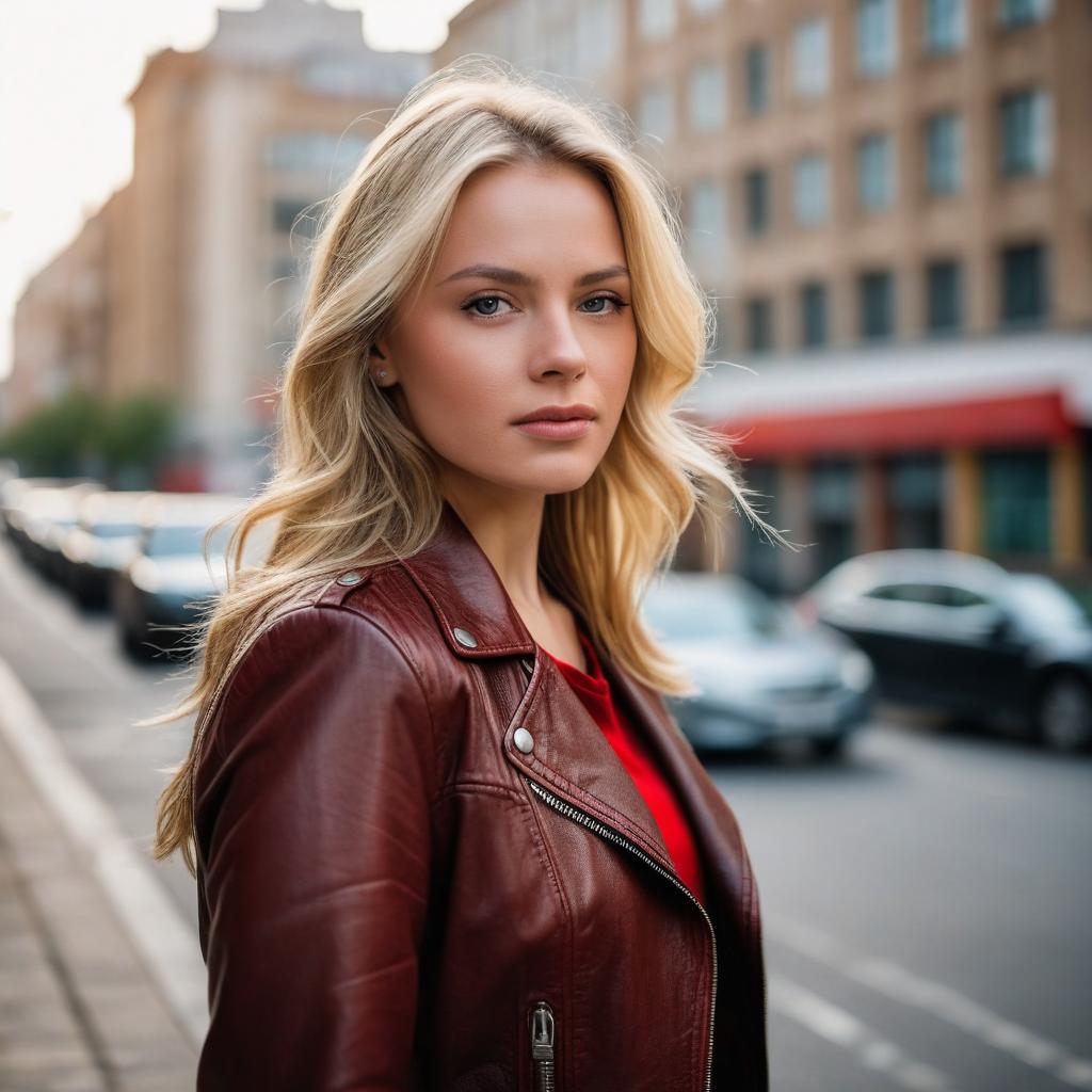 A realistic portrait of a blonde woman with long hair and natural makeup, wearing a brown leather jacket and a red blouse, standing on a city street with blurred cars and buildings in the background, captured with soft natural lighting and shallow depth of field to create a cinematic and warm atmosphere