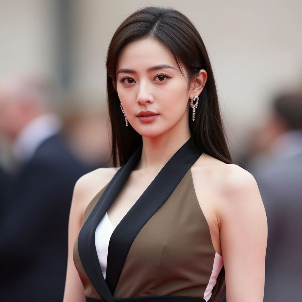Photograph of an East Asian woman with long, straight black hair and fair skin. She wears a sleeveless, brown dress with a black V-neck strap and white trim, revealing a modest cleavage. Her makeup is natural with slightly glossy pink lips. She has dangling silver earrings. The background is blurred, showing indistinct figures in dark clothing, suggesting a formal event or red carpet setting. The lighting is soft, highlighting her face and upper body. Her expression is calm and confident.