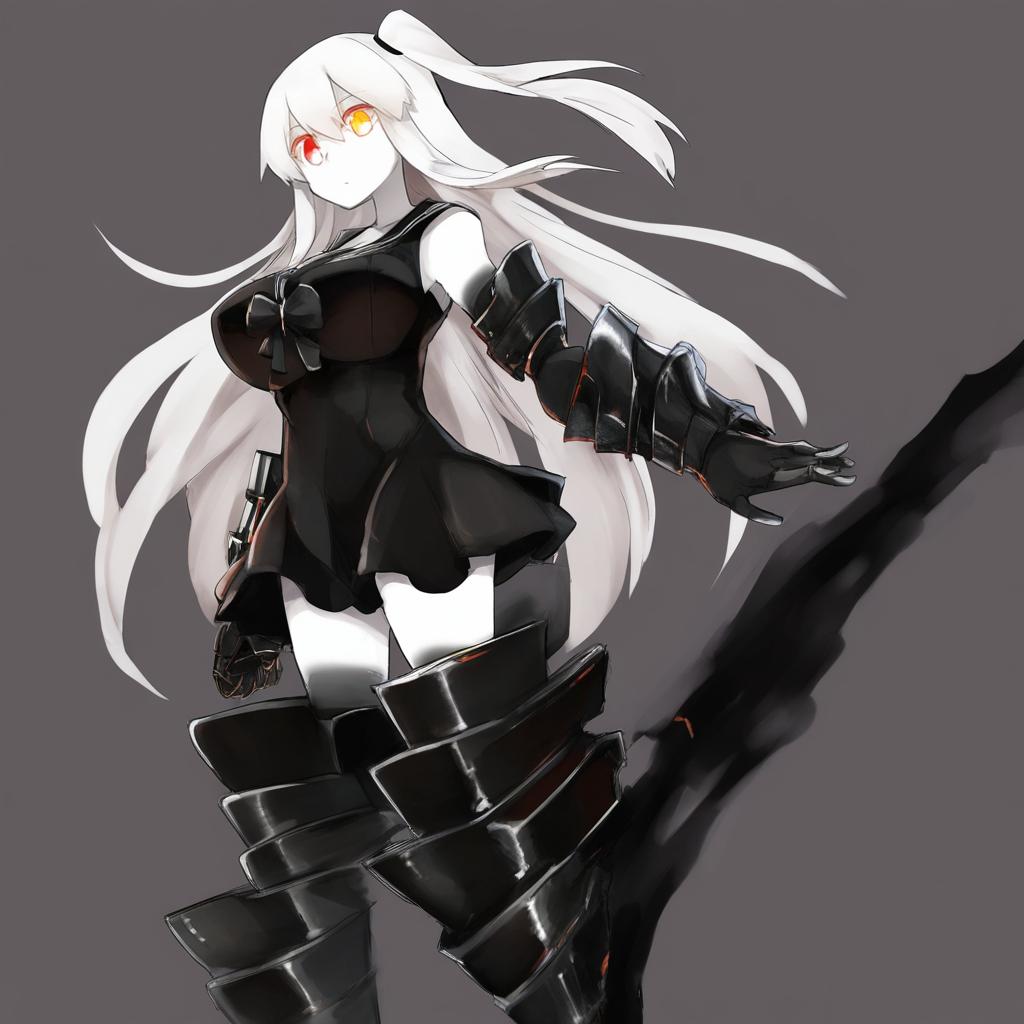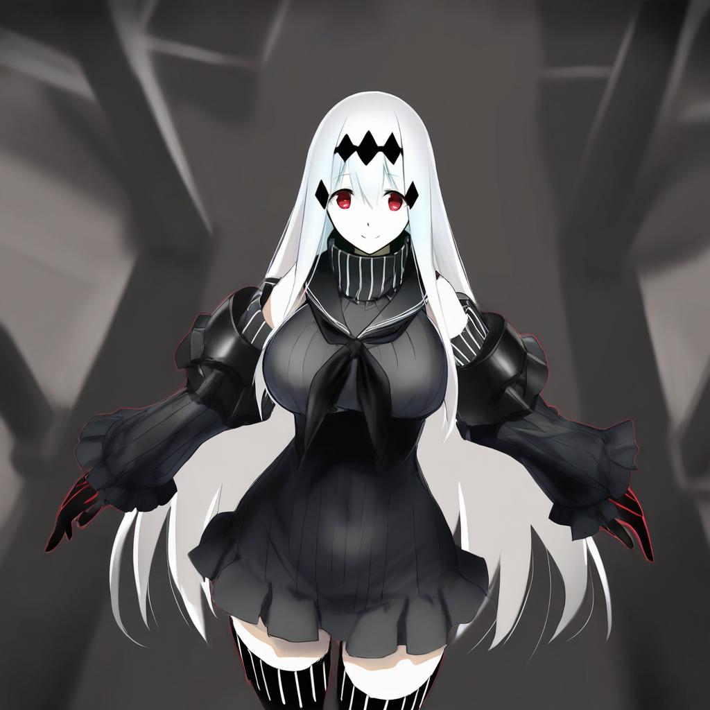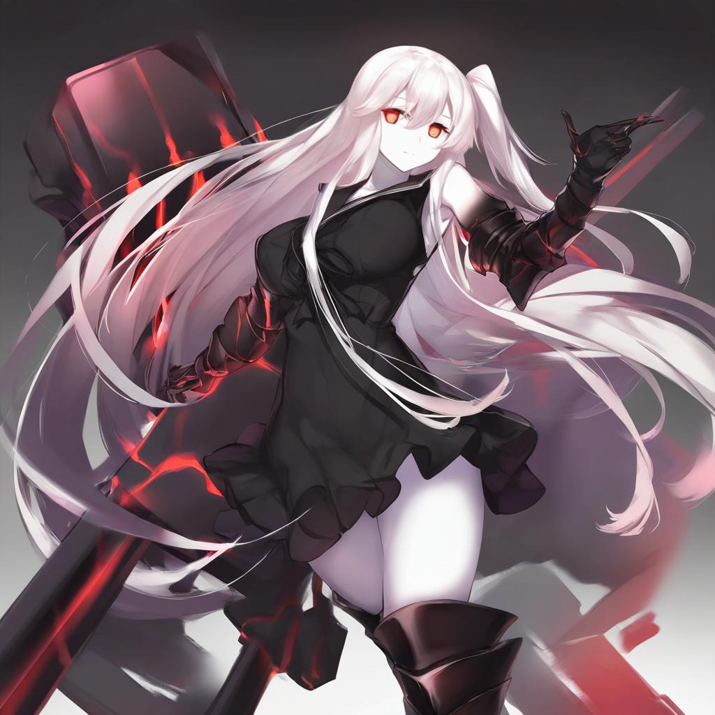 Digital anime-style illustration of a girl with long blonde hair in twin side ponytails, red eyes, and medium breasts. She is dressed in a black gothic dress with bare shoulders, paired with detached sleeves and black nail polish. The character is set against a dark, cracked background, emphasizing a goth fashion theme.