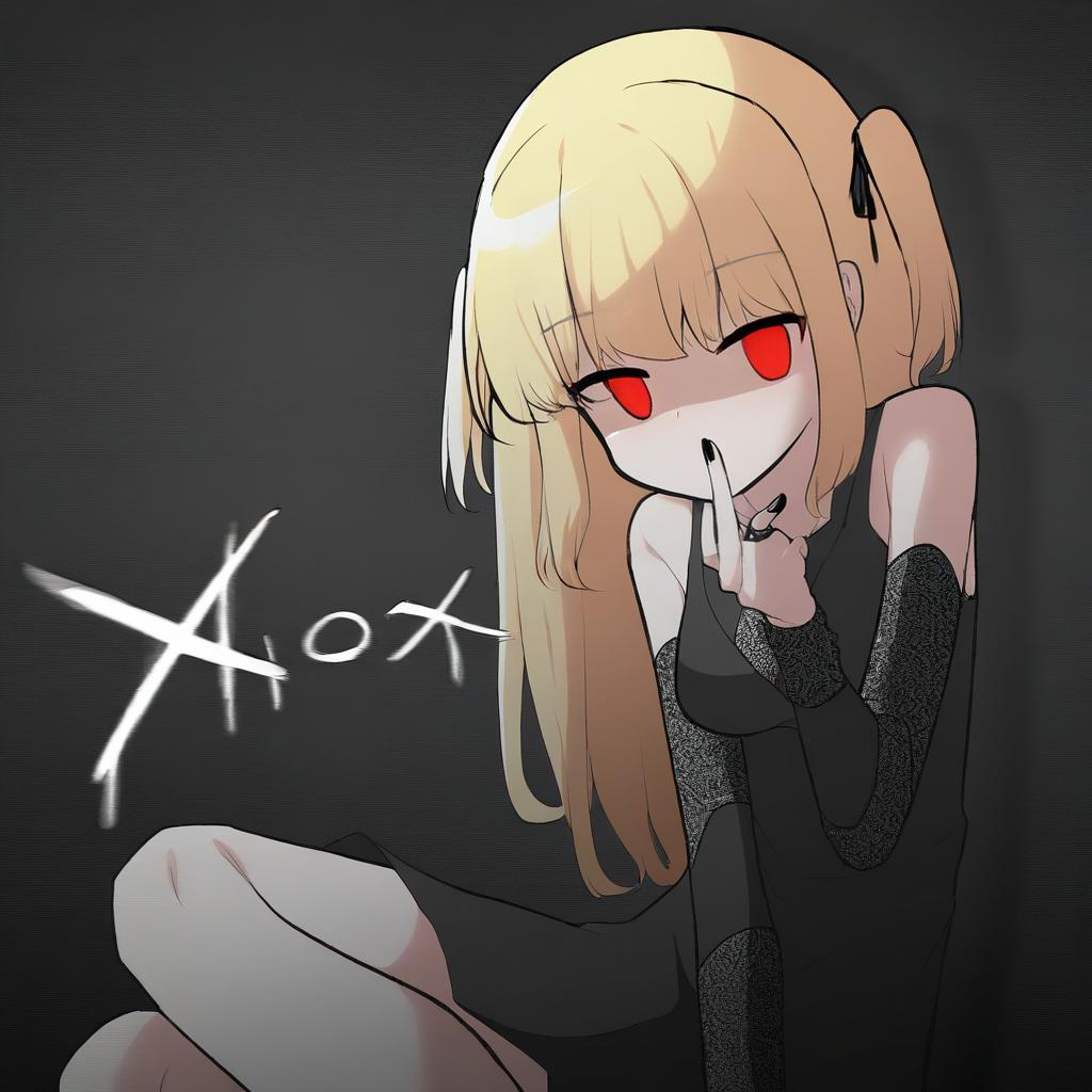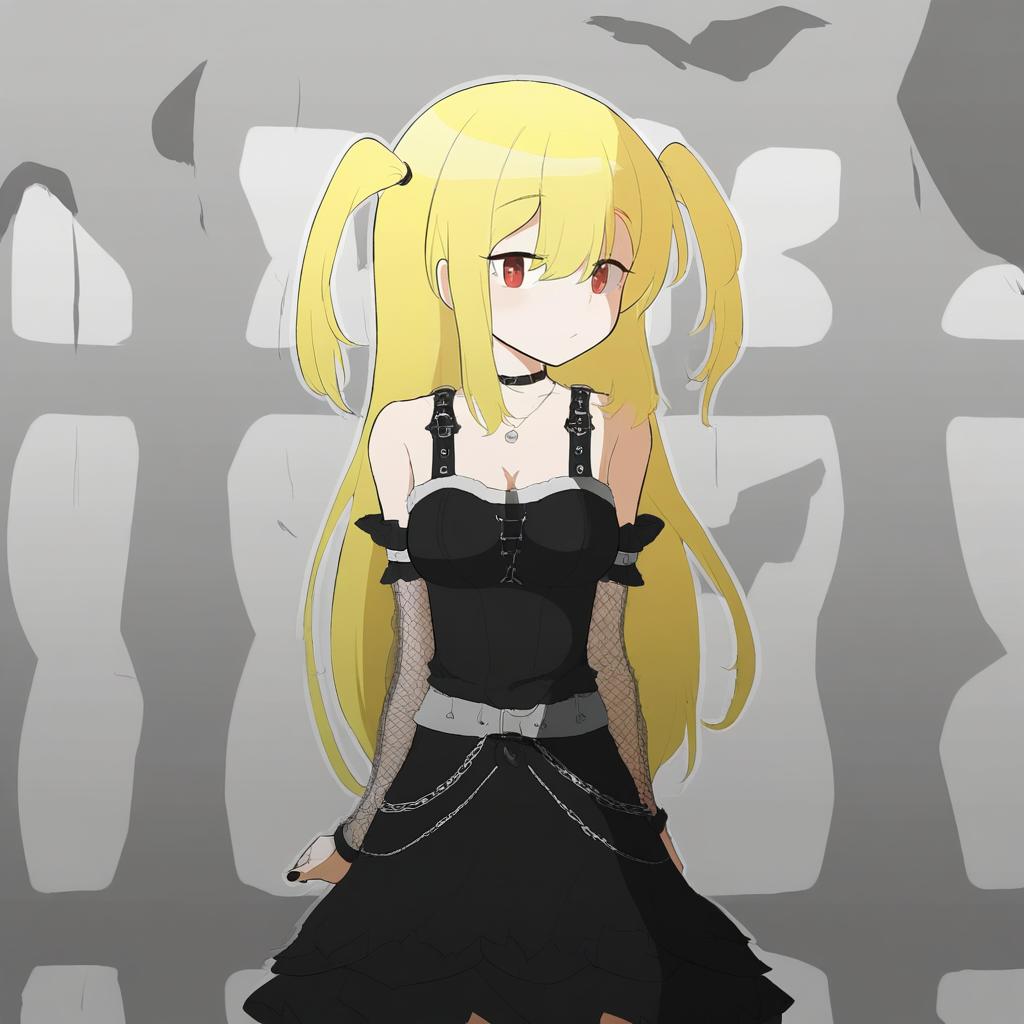 Amane misa, death note, 1girl, red eyes, blonde hair, long hair, two side up, medium breasts, black dress, bare shoulders, detached sleeves, nail polish, goth fashion, goth fashion, by artist hagoonha, leet