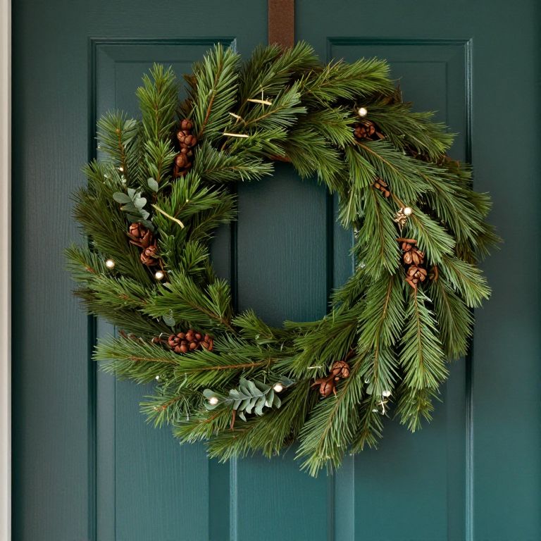 Photograph of a lush, green pine wreath adorned with red berries, small white and silver baubles, and silver eucalyptus leaves. The wreath is hung on a dark teal, wooden door with raised panel detailing. The pine needles are vibrant and textured, contrasting with the smooth, matte finish of the door. The overall composition is festive and traditional, evoking a holiday spirit. The wreath is centrally positioned, with the door's vertical panels providing a subtle background.