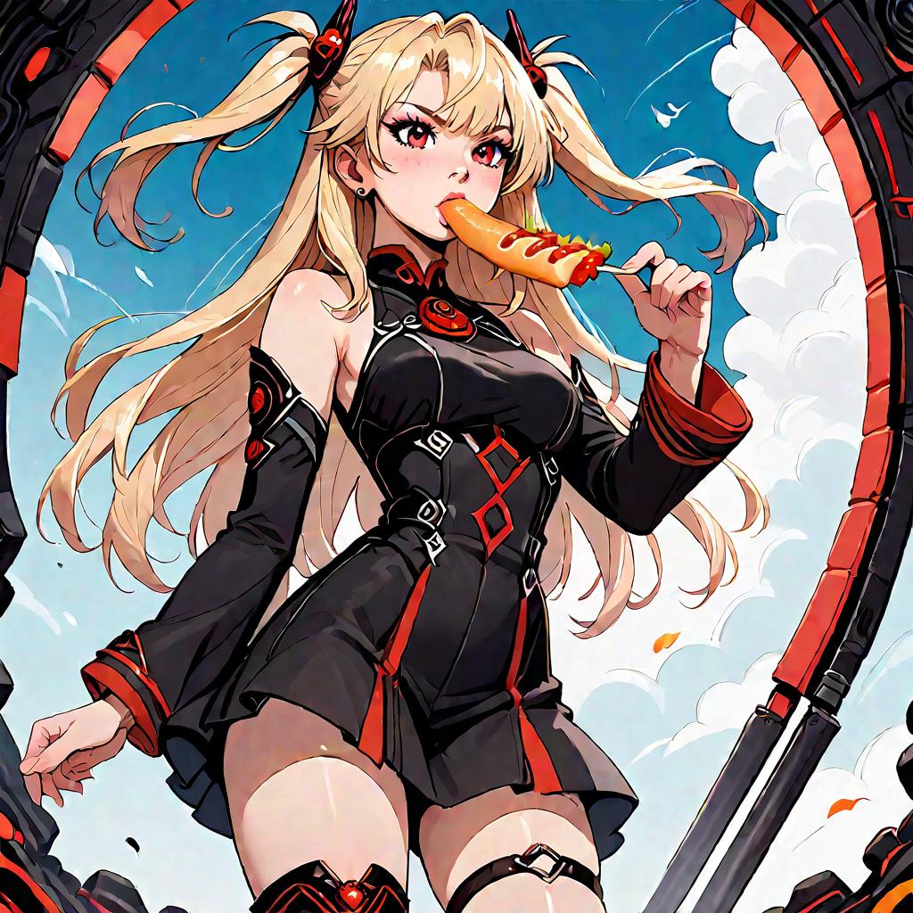 Score_9, score_8_up, score_7_up, score_6_up, score_5_up, score_4_up, source_anime, screenshots, 1girl, konjiki no yami, long hair, blonde hair, two side up, hair ornament, red eyes, black dress, bare shoulders, detached sleeves, boots, thigh strap, taiyaki, eating
