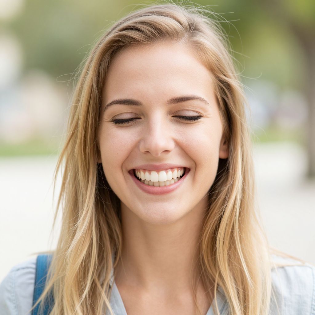 A bright, close-up photograph of a smiling woman with light skin and long, blonde hair that's slightly messy. She's wearing a light gray shirt with a blue strap over her shoulder. Her eyes are closed, and she's showing her teeth in a wide, genuine smile. The background is softly blurred with green and white, suggesting an outdoor park setting. The lighting is natural, highlighting her cheerful expression.