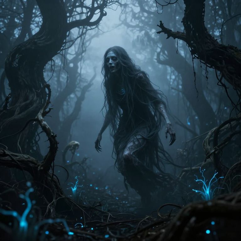 A digital fantasy artwork depicts a haunting, humanoid figure with long, tattered, and matted hair, and sunken eyes, emerging from a dark, foggy forest. The figure's skin is pale and decaying, with visible bones in the hands and feet. Surrounding trees are twisted and gnarled, with glowing blue bioluminescent plants scattered at the forest floor. The eerie blue light contrasts with the dark, shadowy background, creating a chilling atmosphere. The figure's expression is vacant and ghostly, adding to the overall spooky and mysterious ambiance of the scene.