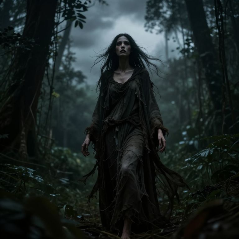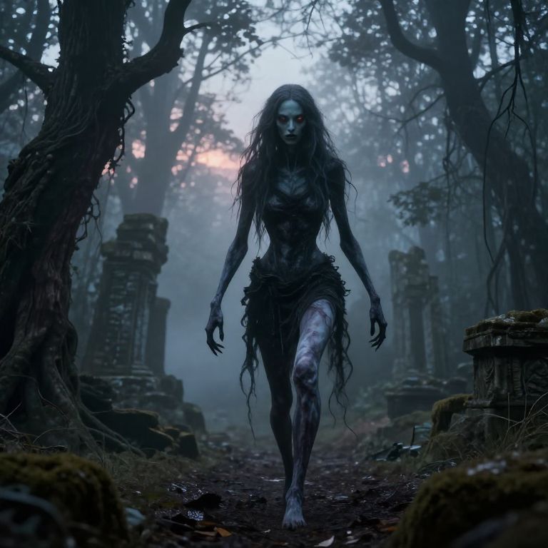 Digital art: Mysterious, eerie forest creature with long, tattered hair and skeletal face emerges from dark, misty woods, surrounded by glowing blue