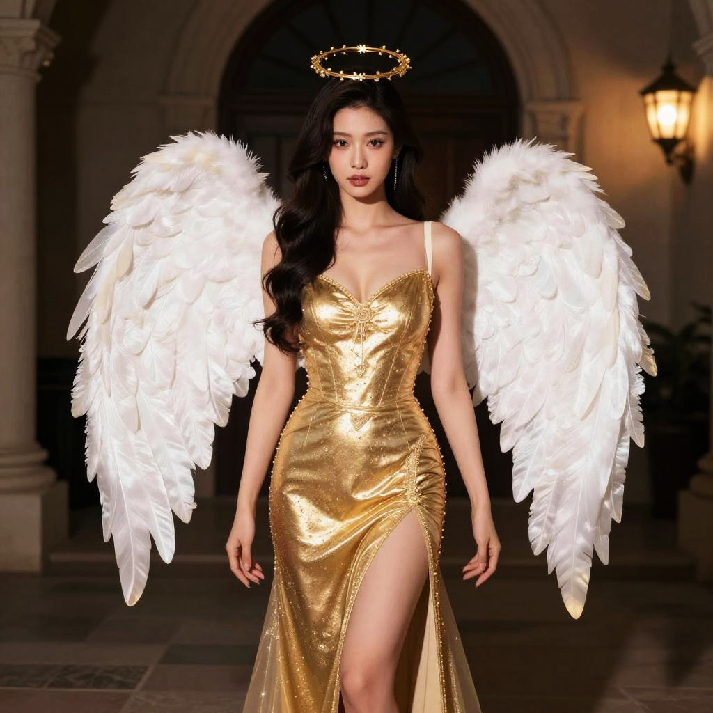 Night Angel Costume, woman dressed in a golden dress with angel wings