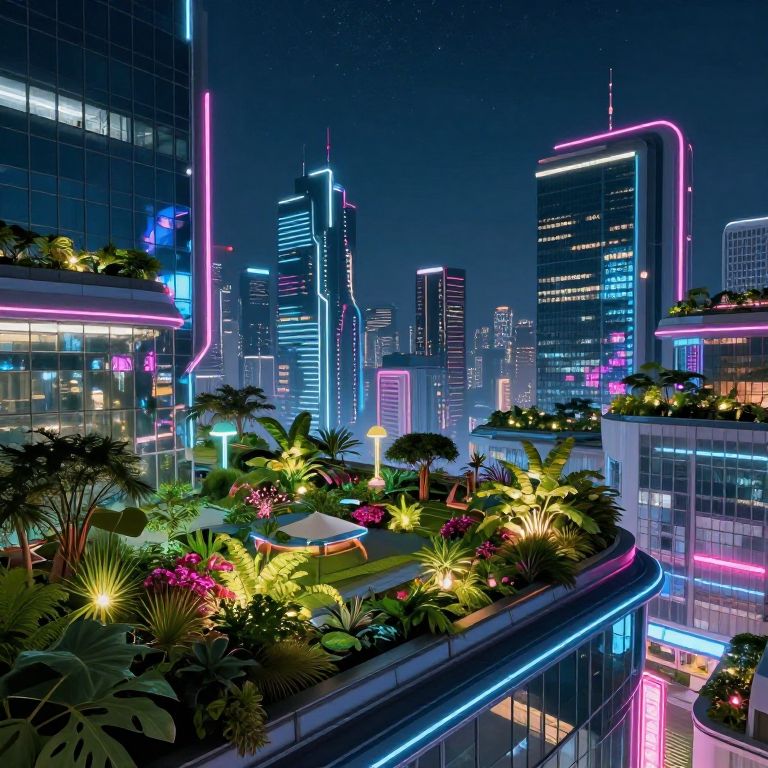 Finn's futuristic cityscape rooftop garden at night, neon signs reflecting off glass buildings, lush greenery blending with sleek architecture, stars twinkling above, inspired by cyberpunk aesthetics with vibrant colors and detailed elements.
