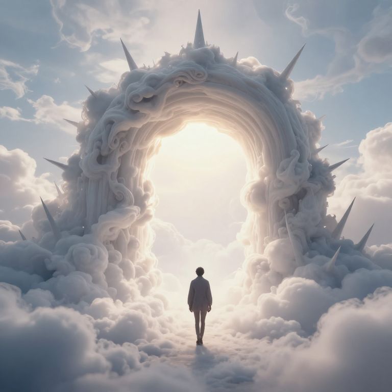 A solitary figure walks toward an ethereal archway crafted from swirling clouds and spiked formations, where the boundary between reality and dreams dissolves into radiant light.