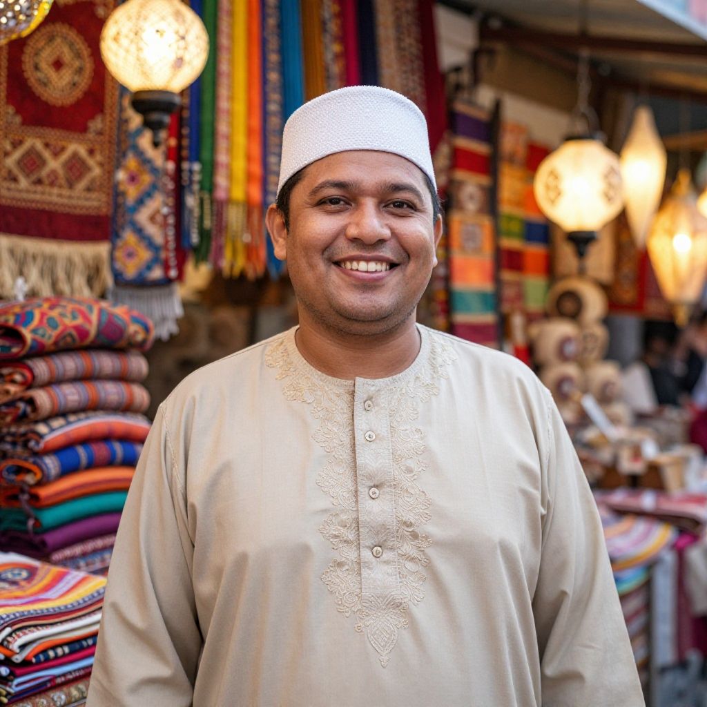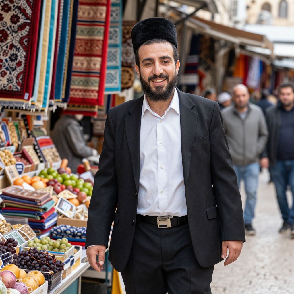 Handsome Jewish man with olive skin and a warm smile, walking through a bustling market street in Jerusalem, vibrant background, colorful fabrics and fresh produce, lively and authentic atmosphere