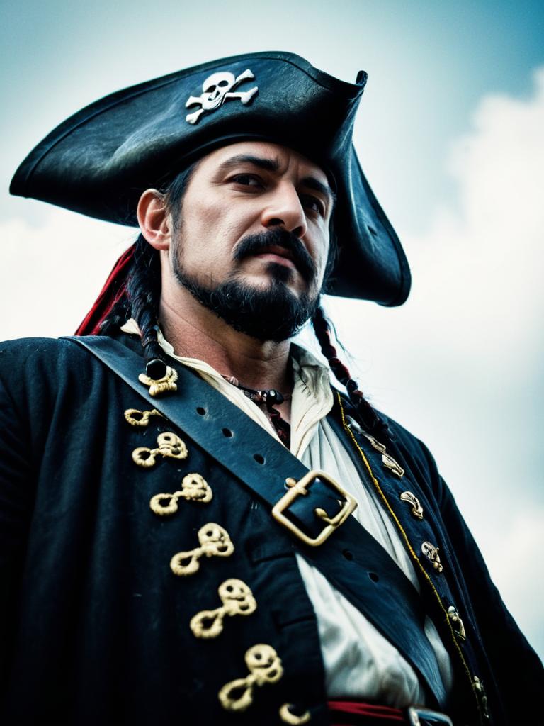 Man in Pirate Costume, cinematic realism, dramatic low-angle cosplay portrait