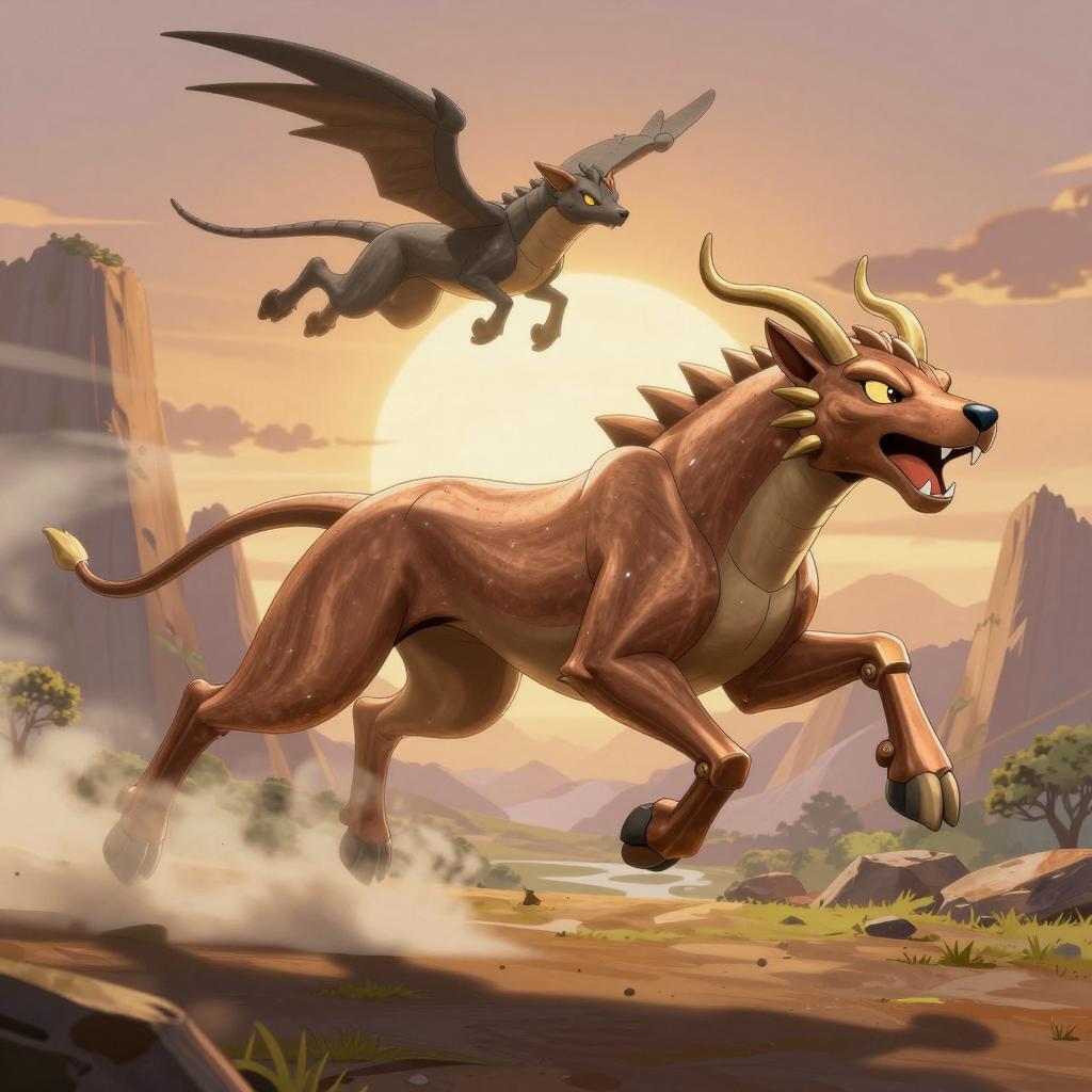 Digital artwork depicting a fierce manticore with bronze and light bronze colors charging forward in a mountainous landscape at sunset, accompanied by a gray winged dragon flying overhead. The scene captures dynamic motion and speed in a fantasy setting with rocky terrain and distant mountains under a large setting sun.