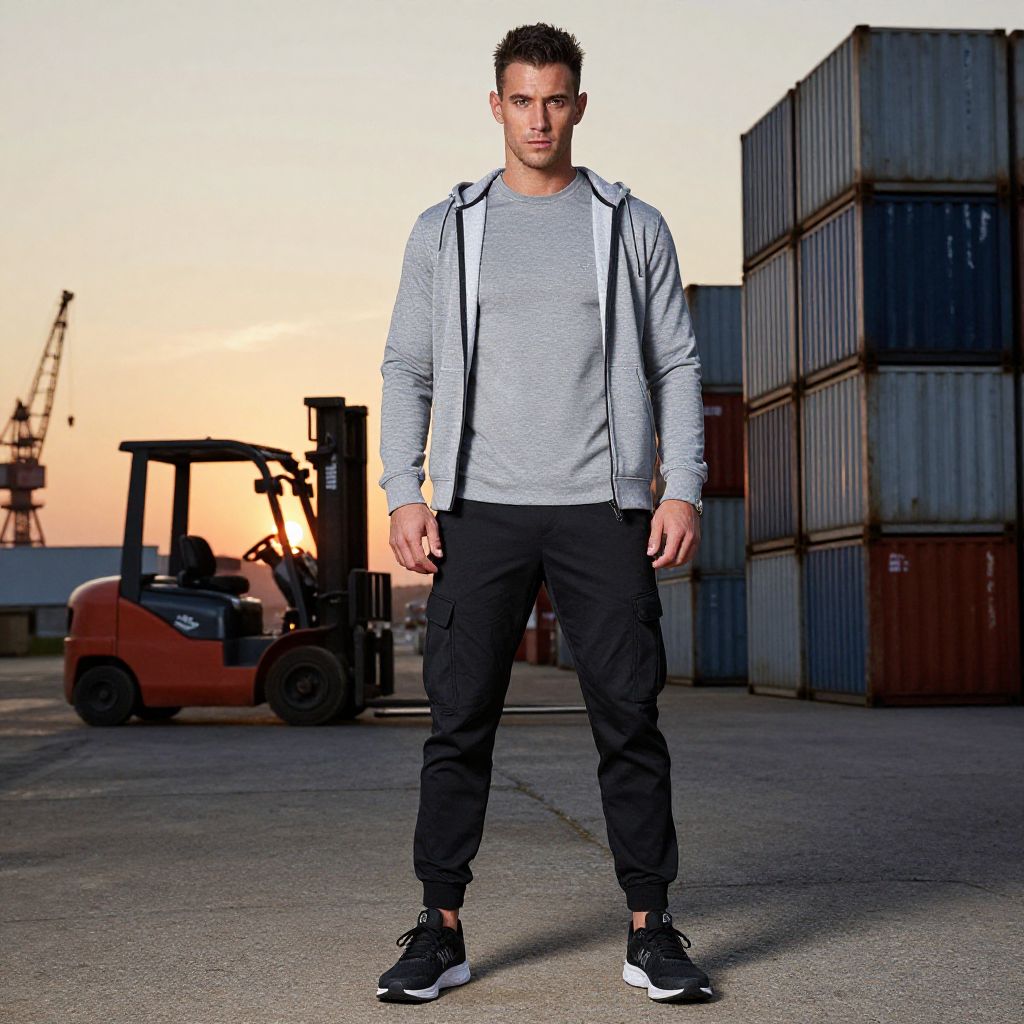 A man, sporty vibe, black cargo joggers, grey moisture-wicking t-shirt, lightweight zip-up hoodie, black running shoes, steel containers stacked high, bustling forklifts maneuvering, distant cranes silhouetted against the sunset, lithographic film style, focused expression. Man has masculine face and piercing eyes