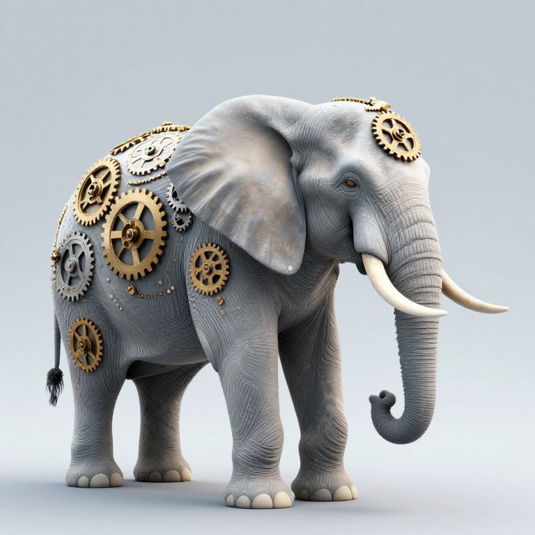 Digital artwork of a grey, textured elephant adorned with intricate, gold and silver gears on its body, standing against a light blue background. Steampunk