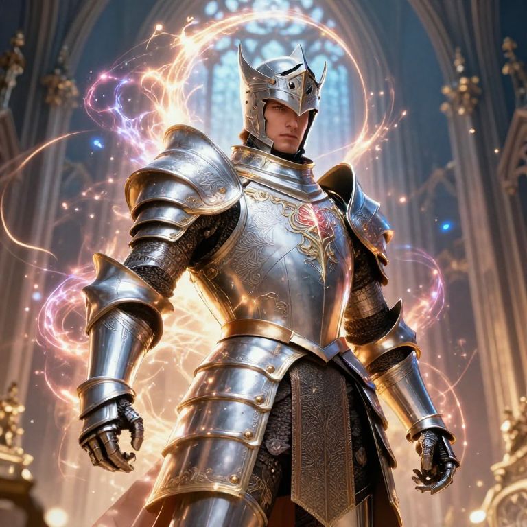 Paladin character art showing a heroic figure in ornate plate armor with intricate engravings, surrounded by a mystical aura of light and energy, set against a gothic cathedral backdrop, emphasis on strength and righteousness, vibrant colors and dramatic lighting.