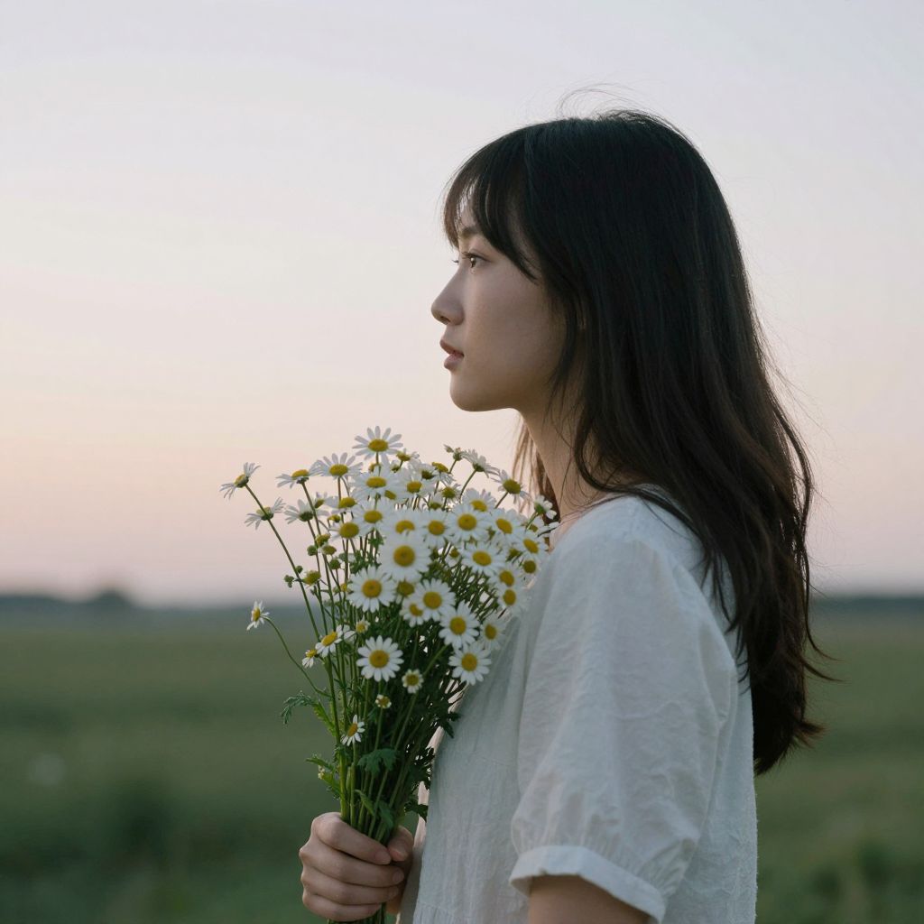 Photograph of a young Asian woman with long, dark brown hair, standing in profile against a soft, pastel-colored sunset sky. She wears a loose, white, short-sleeved linen shirt and holds a small bouquet of white daisies with yellow centers in her right hand. Her expression is serene, and she gazes to the left. The background features a blurred, expansive green field. The light from the setting sun casts a gentle, warm glow on her hair and the flowers, creating a tranquil, natural atmosphere. The image emphasizes simplicity and calmness.