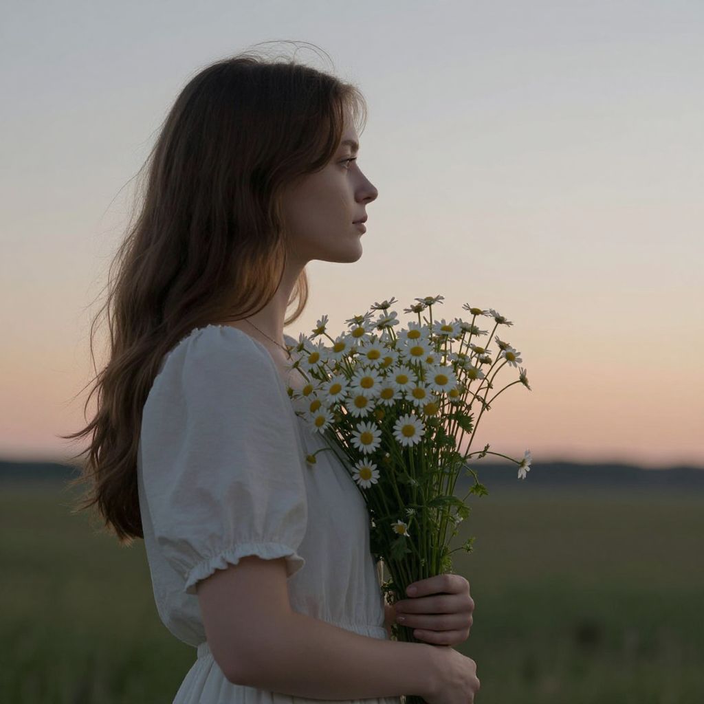 Serenity and introspection intertwine as a woman cradles a bouquet of delicate daisies, her gaze drifting toward a horizon where the boundaries of earth and sky dissolve into a quiet, timeless embrace.