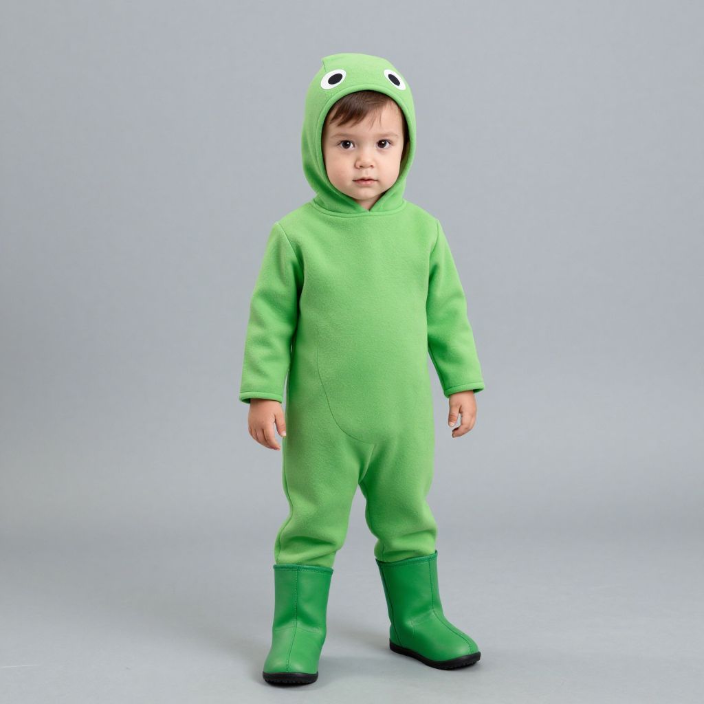 Photograph of a young child with light skin, brown hair, wearing a green frog-themed onesie with matching boots, standing against a light gray background